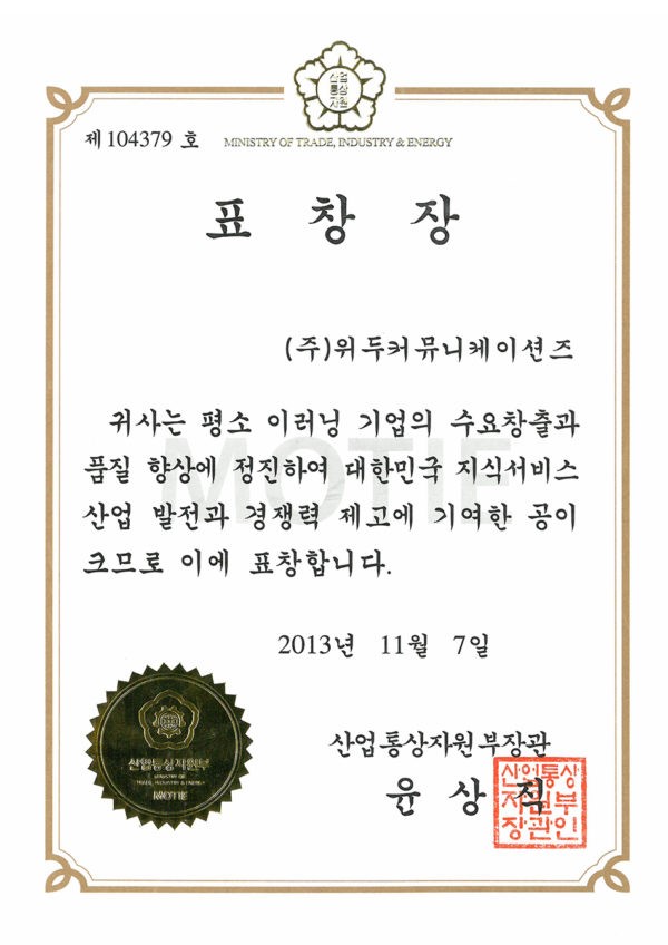 이러닝 기업의 수요 창출과 품질 향상 페이지 정보 작성자 WeDu 댓글 0건 조회 6,322회 작성일 19-05-30 19:32 본문 2013-11-07 표창장 제 104379호 이러닝 기업의 수요 창출과 품질 향상 산업통상자원부장관 윤상직 List Previous한국여성벤처협회 표창장 19.05.30 Next이러닝 콘텐츠 품질 인증 우수 심사 19.05.30