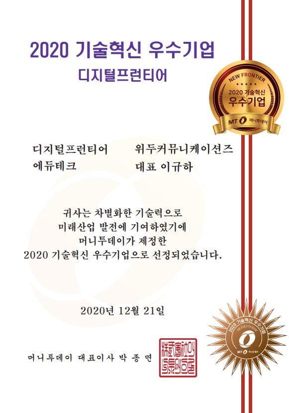 2020 기술혁신 우수기업 페이지 정보 작성자 WeDu 댓글 0건 조회 6,650회 작성일 21-12-31 12:58 본문 2020-12-21 2020 기술혁신 우수기업 디지털프런티어 에듀테크 머니투데이 대표이사 List Previous2020 소년한국 우수 어린이 도서 선정 21.12.31 Next2020 서울산업진흥원 2020 DMC어워드 21.12.31
