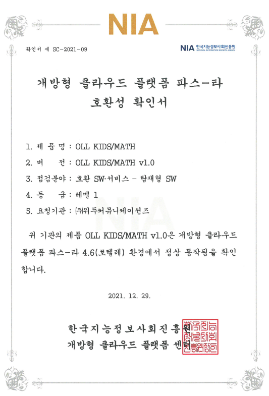 [한국/확인서] OLL KIDS/MATH 파스-타 호환성 확인서 페이지 정보 작성자 WeDu 댓글 0건 조회 10,952회 작성일 21-12-31 12:48 본문 2021-12-29 확인서 제 SC-2021-09 점검분야 : 호환 SW서비스 - 탑재형 SW List Next[한국/인증서] OLL KIDS/MATH 클라우드 서비스 확인서 21.12.31